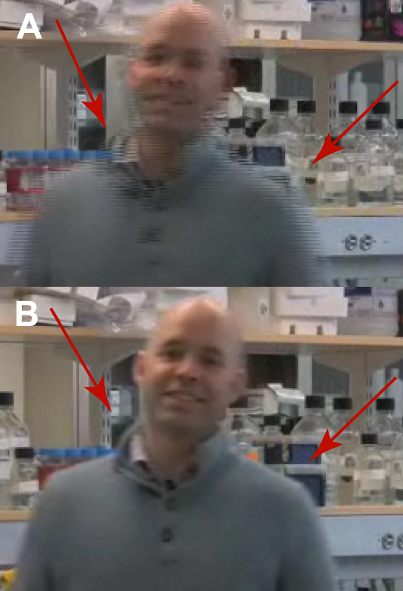 Figure 2. The power of deinterlacing- before and after. A) In this scene, I'm walking right to left. Interlacing of the fields reveals significant tearing in areas of high motion (indicated by red arrows). B) The same scene after deinterlacing the video. I'm quality has significantly improved, although unfortunately no hair was restored.