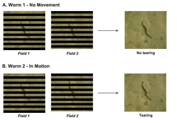 Take the example of a worm on a petri dish (see Figure 1). If the worm is sitting perfectly still, then the subject is in the same place during the consecutive scans (even pixels and odd pixels). Since there was no motion, the two fields line up perfectly when combined, yielding a high resolution image.