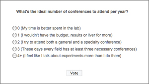 Conference season is in full swing and many of our poster tubes have logged more mileage than Mark Hamill got from Star Wars. Coming off of the recent American Chemical Society (ACS) and American Association of Cancer Research (AACR) meetings, there is little rest before the summer Gordon conference schedule begins. Although a scientific conference rarely lasts for more than a week, we often prepare for months on end – performing last-minute experiments, designing beautiful posters and battling large-format printers. So how many times a year should we be putting ourselves through this wringer?