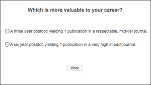 […] everything from job offers to funding awards to ego boosts. However, in last weeks’ poll (How Valuable is a Top-Tier Publication) an overwhelming majority of scientists thought it was a better career move to finish a postdoc in […]